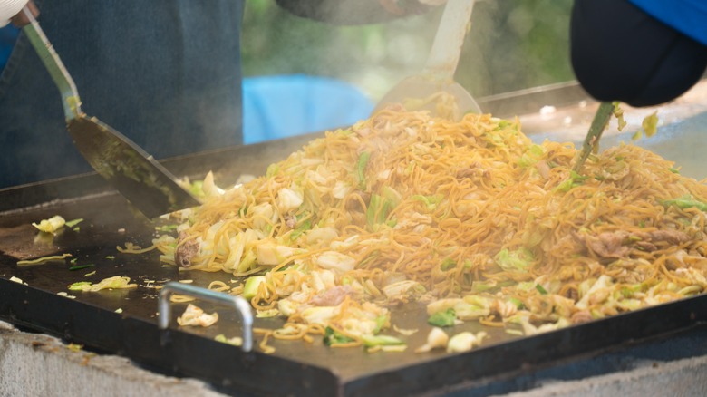 Since its humble beginnings several decades ago, yakisoba has evolved. Soba noodles are tossed in a tangy sauce made from soy sauce, oyster sauce, Worcestershire sauce, and sugar. Cabbage remains a main ingredient, while other veggies like carrots, onions, bell peppers, and bean sprouts are now added into the mix. Today, Yakisoba recipes also commonly include meat such as thinly sliced pork and chicken, or seafood like shrimp and squid. Yakisoba can be topped with garnishes like shredded pickled ginger, seaweed or seaweed powder (nori/aornori), and fish flakes.