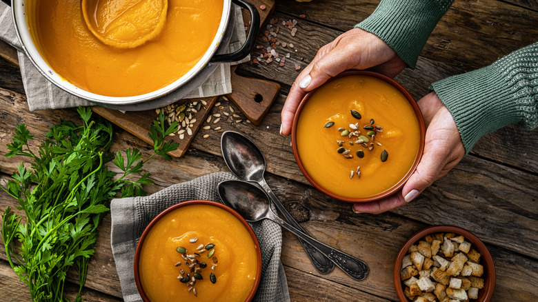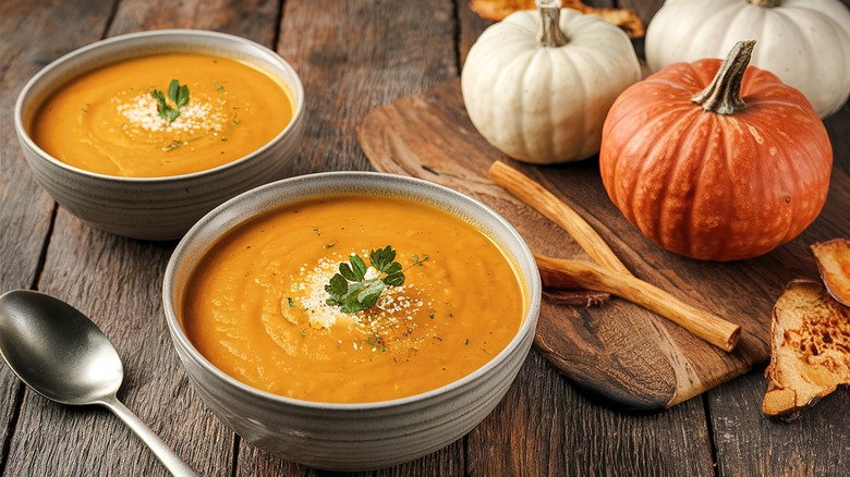 If you take a bowl of fresh pumpkin puree and put it next to a serving poured straight from the can, there are some pretty obvious differences you can pick up on just by looking at them. Fresh pumpkin puree is usually lighter in color, with a visibly looser texture. While the ingredients are essentially the same, the canned puree will have a noticeably darker appearance due to the way its processed or the variety of pumpkin it's made from. While colors can range depending on the variety of canned pumpkin puree you prefer, the one thing that will remain the same is its consistency. Compared to the light and fluffy fresh puree, the regular canned variety is thick and smooth. While there are ingredients you can reach for to enhance the texture of your soup, when you opt for canned pumpkin puree over fresh, it will come out creamier — and with much less effort involved.