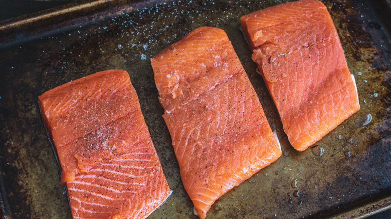Two tricks make this salmon cooking technique a win. The first is preheating your baking sheet in an oven set to 500 degrees Fahrenheit. Putting the salmon filet onto the hot pan will immediately start to cook the flesh and render the fat under the skin. Then, you drop the oven temperature — a lot. Like, all the way down to 275. Why? This lower temperature gently cooks the salmon to avoid any rubbery texture or dry spots. And since you're using a baking sheet, you could easily cook four to six filets this way at once.