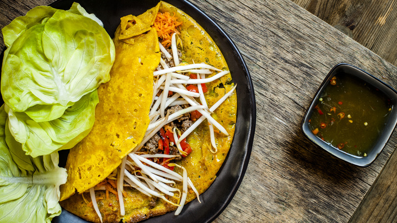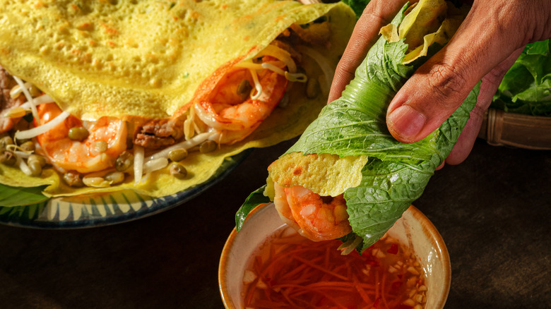Fortunately, nuoc cham's power works in a pretty straightforward way, so pairing it with bánh xèo is relatively easy. Just whisk the essentials together until the sugar is fully dissolved, allowing your preferred taste to be your guide with regards to specific quantities of each ingredient. If you're new to this sauce or want to make it ahead, start with a safe base of fish sauce, sugar, and water then adjust the spice and flavorings as you go. Once done, serve it on the side of the bánh xèo dish for a convenient dip whenever you want.