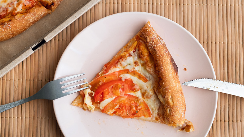 Normally, with leftover pizza, 60 seconds in the microwave is all it takes for a quick and easy meal, making it the epitome of convenience. Fortunately, turning it into a grilled cheese isn't much more complicated than that. Just press two slices together with the crust facing outward, sandwich your preferred cheese in between, and spread butter on the exterior. With the griddle or frying pan properly heated, cook the "sandwich" with the lid covered for around 5 to 7 minutes. Then, flip to the other side and repeat the process. Once both sides are slightly crispy and golden brown with the cheese perfectly melted, that's when your pizza grilled cheese is ready.
