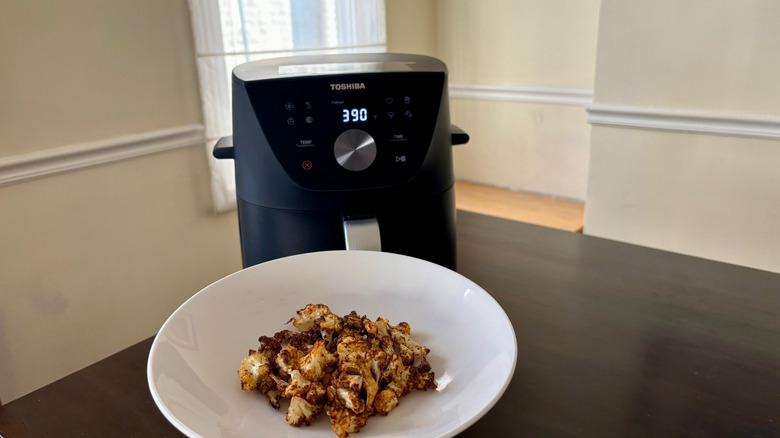 To get a feel for how the Toshiba Air Fryer performed, I air-fried bone-in chicken as well as cauliflower florets. I seasoned the chicken with spices, but no oil, and it crisped to a deep golden brown, while fully cooked through, in about 20 minutes. After removing the meat from the basket, I was able to pour off the accumulated chicken drippings and cook a second batch. Each batch requires going through the preheating step, but it is such a short amount of time that it doesn't feel laborious.
