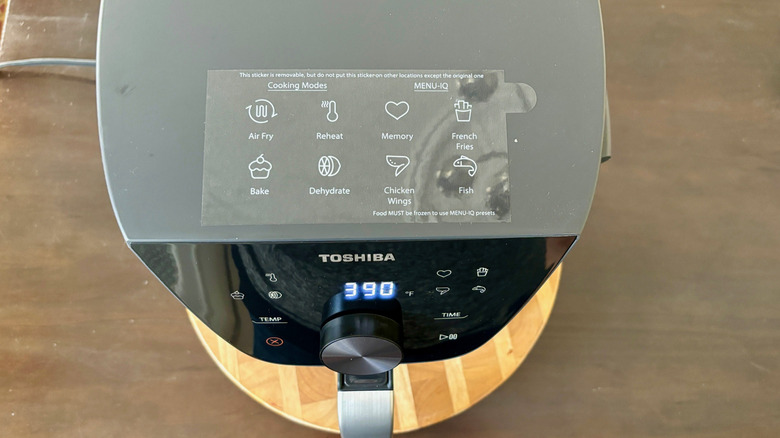 The Toshiba Air Fryer has three Menu-IQ presets: French Fries, Chicken Wings, and Fish. These presets work only with frozen foods and do not require preheating the air fryer. To use them, add the food of your choice to the basket and select the correct preset. The unit will take a few minutes to calculate the cook time based on the type and quantity of food and then begin cooking. You can adjust the time and temperature at any time during the cooking, but it will cancel the automatic calculation if you do so before the air fryer starts cooking.