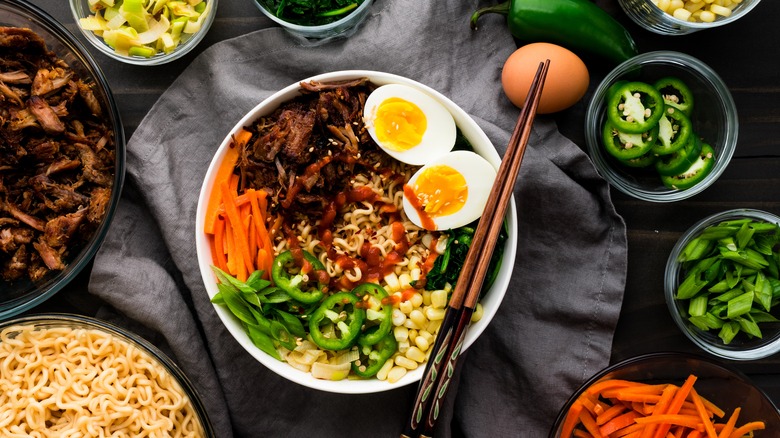 Bailey also suggested, "Adding your favorite protein, even something convenient like rotisserie chicken, helps for a more leveled-up flavor." From hard boiled eggs to fried tofu, this is a great way to boost nutrition, too. And while noodles can be filling, protein is the most effective nutrient for sating people's appetites, so no one will leave the table feeling hungry.