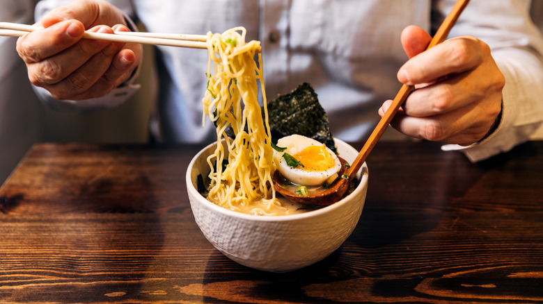 Adding texture can boost the appeal of a bowl of noodles, too. Mixing in some bouncy mushrooms, crisp peas or peppers, and crunchy broccoli makes each forkful an adventure, and a sheet of dried seaweed can provide crispiness and umami flavors. A garnish of roasted pine nuts or almond slivers is always welcome, too. Finally, don't overlook the power of herbs and spices. Red pepper flakes, smoked paprika, or Japanese shichimi can all change ramen for the better. Borrow one — or several — of these ideas, and turn your budget meal into something everyone looks forward to eating.