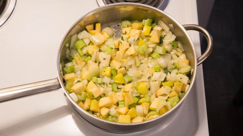 - Add the garlic, onion, celery, and fennel and saute for 5 to 6 minutes, until softened.