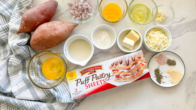 You'll need some frozen puff pastry sheets along with butter, milk, eggs, and Gruyère cheese. Then hit up your pantry for garlic granules, salt, pepper, dried thyme, and flour.