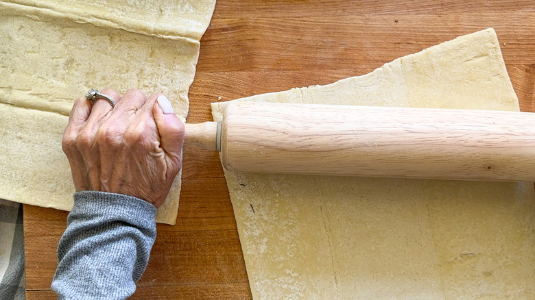 - Roll the puff pastry out to thin it and remove the fold lines.
