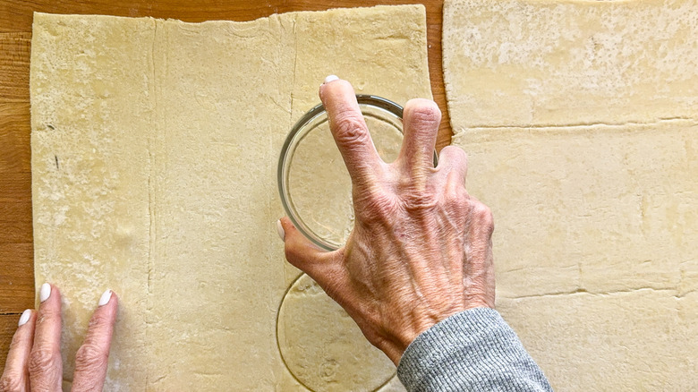 Take a 4-inch bowl or cutter and cut out 16 circles from each dough sheet. You will need to re-roll scraps to get the last few circles.