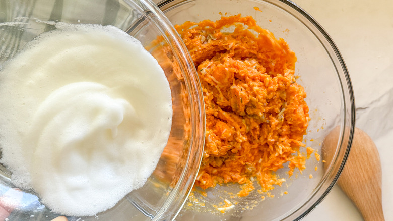 - In a medium bowl, beat the egg whites with an electric mixture until soft peaks form.