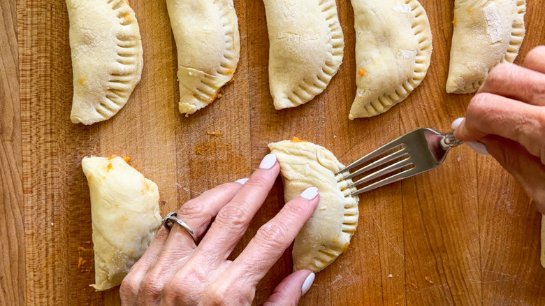 - Fold the dough over, seal it with your fingers, and use a fork to add a fluted edge.