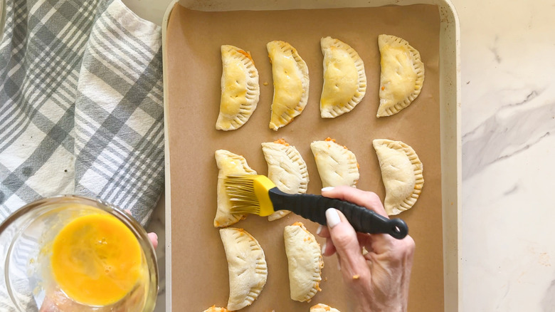 - Brush each pie with the beaten egg and bake for 12-15 minutes until puffy and golden.