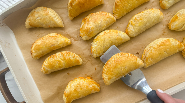 There are many ways to repurpose the sweet potato filling for use in other recipes. For starters, you can make a larger version of the hand pies if you want them to be more of a main dish. If you want to keep the arched half-circle shape, use a 6-7-inch round shape to cut out the dough. You can also cut a 6x6-inch square out of the dough and fold opposite points to form a sealed triangle. On the other hand, for a smaller version, you can make half a batch and fill pre-made phyllo cups for a pop-in-your-mouth appetizer.