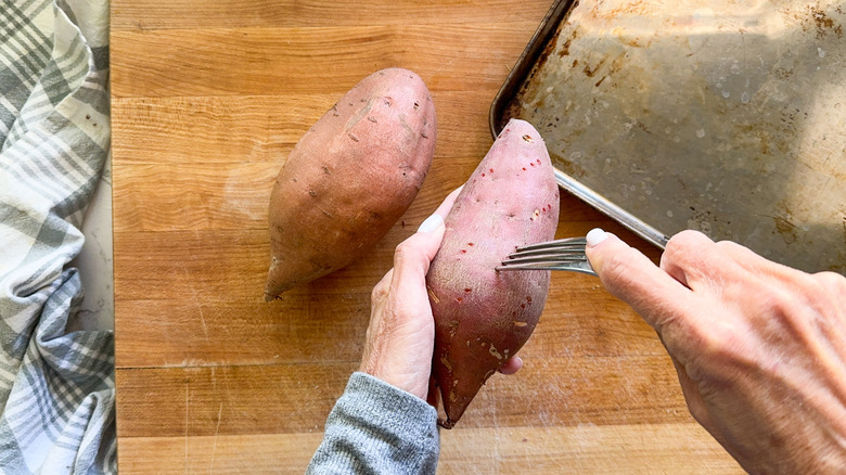 - Poke the sweet potatoes several times and place them on a baking sheet. Bake for 30-45 minutes.