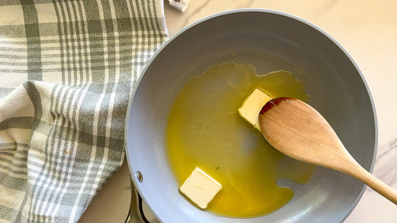 - While the sweet potatoes are cooking, add the butter to a frying pan and bring the heat to medium-high