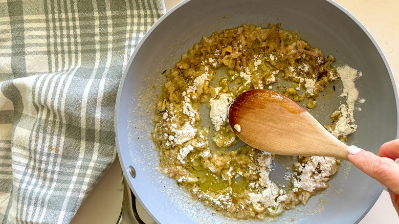 - Add the shallot, garlic, garlic granules, salt, pepper, and thyme. Cook for 8 minutes.