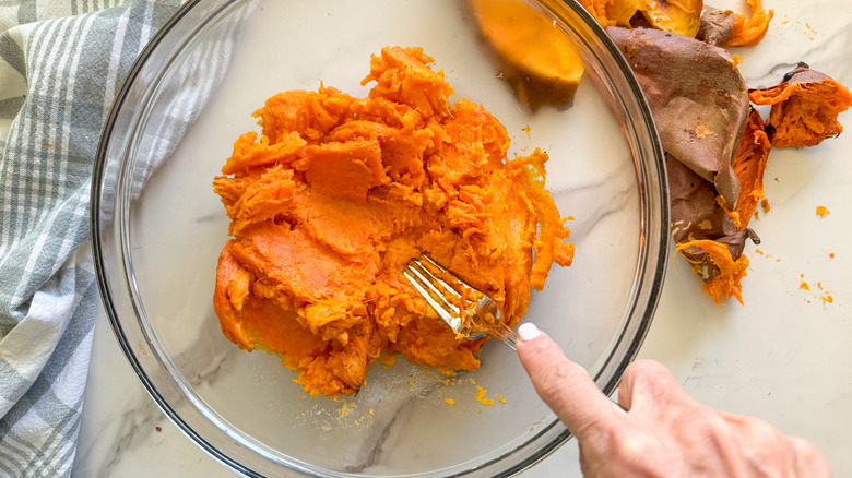- When the potatoes are done scoop out the flesh into a bowl and discard the skin. Mash the flesh with a fork.
