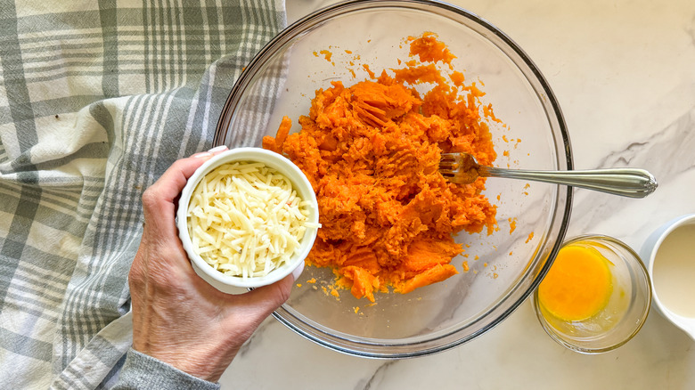 Add the shallot and garlic mixture to the potatoes along with the milk, egg yolks, and cheese.