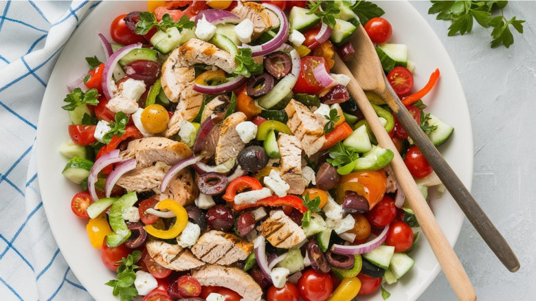 Chances are you may have encountered a spoon salad at some point without knowing it — there isn't much difference between a chopped salad and a spoon salad. TikTok has sent spoon salads viral, so it's really just the latest way to describe a well-chopped salad. While the name might sound silly, it just means a salad that can be eaten with a spoon rather than a fork, since the ingredients are diced finely enough that you don't need to bother with the tines of a fork for retrieval. There are some salads, like this creamy ditalini pasta salad, that are already chopped finely enough to be eaten with a spoon. Other salads, like a grilled strawberry balsamic chicken and spinach salad, only need a bit of additional knifework to become a superstar spoon salad.