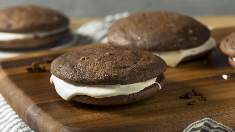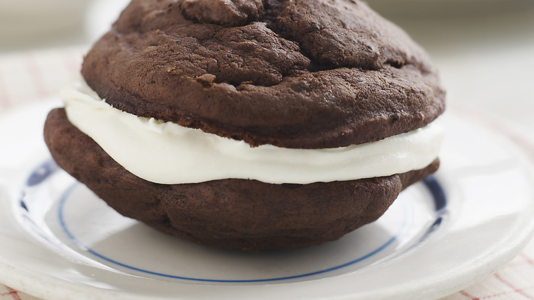 If you're going for the classic, timeless whoopie pie, then you're going to want to opt for a chocolate base with a vanilla filling. The cake itself should be very rich and chocolatey — just like a tasty chocolate layer cake should be. Rather than adding more chocolate to the mix, amplify the flavor of this ingredient by pairing it with coffee. Coffee and chocolate make a heavenly match because they have complementary profiles; the bitterness of the coffee can round out the flavor of the chocolate.