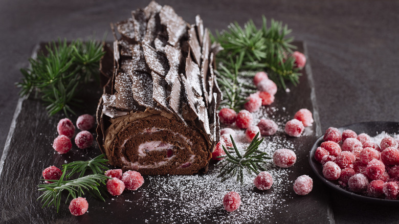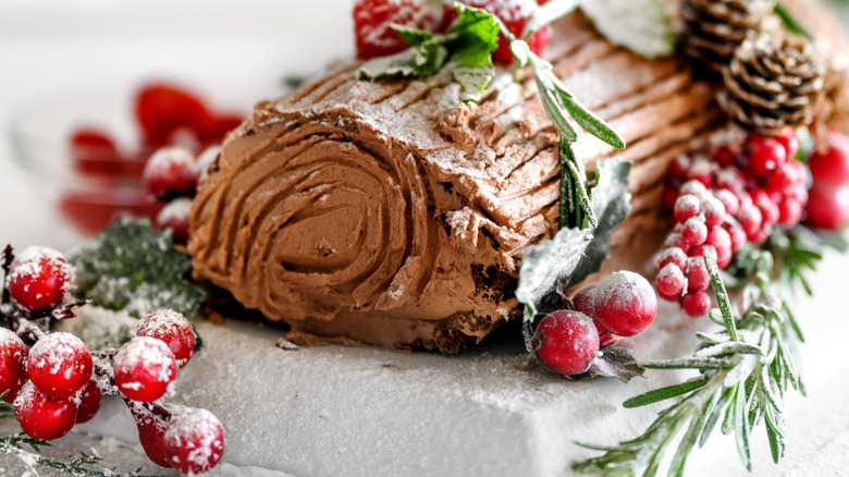 If you're trying to figure out the best way to realistically decorate your Yule log this year, you don't even need to worry about frosting a bark texture onto it. All you need to do is melt some chocolate and spread it over a piece of parchment paper. Let it dry, then roll the chocolate sheet from the paper onto the Yule log. As you do so, the chocolate will crack, creating a bark-like texture.