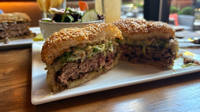 Bourbon Steak has two beef cheeseburgers on its menus: One is a burger made from Prime black Angus beef and topped with aged white cheddar, shallot and red wine compote, and crisp little gem lettuce. The other is a Wagyu burger that takes the fashion of a smash burger, with American cheese, caramelized onions, and a "secret sauce." Both burgers are served on fresh baked sesame seed buns and served alongside a pickle. Beyond the burgers I sampled, there a few other sandwiches to choose from, including a quinoa and veggie burger, a fried chicken sandwich, and a turkey burger, as well.