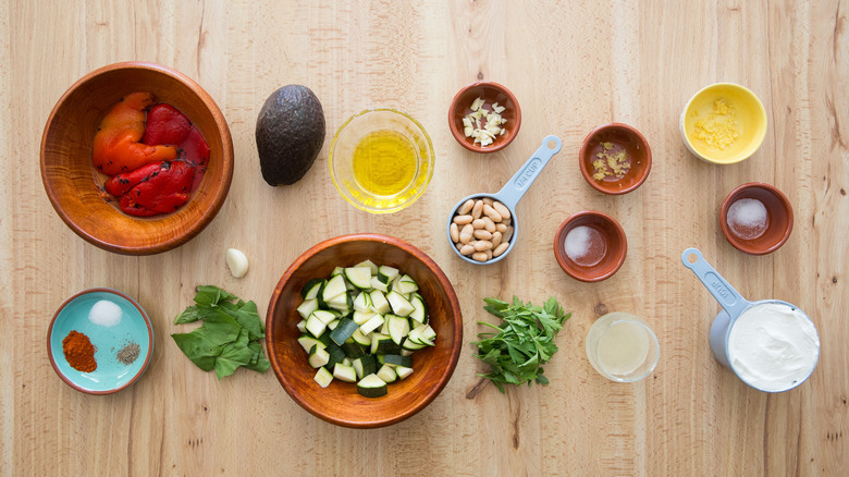 For the green sauce, you will need extra virgin olive oil, garlic, zucchini, salt, cannellini beans, parsley, and water. For the red sauce, you'll first need a Hass avocado. If ripe avocados aren't available in stores, plan ahead to purchase the avocado so it's ripe when you're ready to make the sauce. You'll also need a 12-ounce jar of roasted red peppers, but you'll only need half of the jar for this recipe. The other ingredients for the red sauce are garlic, extra virgin olive oil, basil, sweet paprika, salt, and black pepper. The white sauce calls for Greek yogurt, and you can choose the fat percentage you prefer. In addition, have on hand garlic, extra virgin olive oil, lemon juice, lemon zest, and salt.