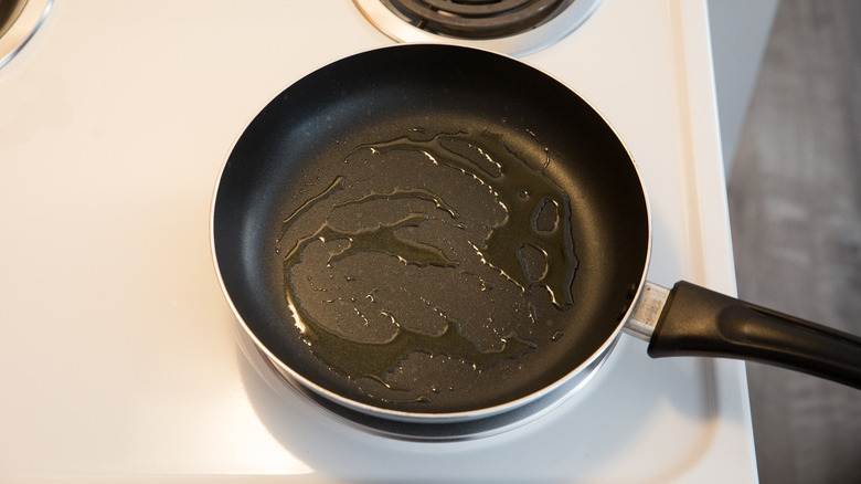 To make the green sauce, first heat the oil on medium in a skillet.