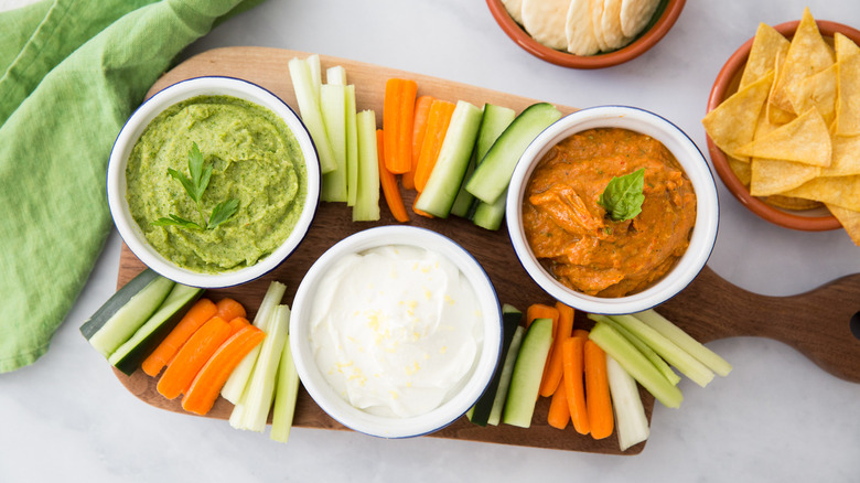 A trio of delicious dipping sauces takes on the colors of the Italian flag with of avocado, zucchini, roasted peppers, cannellini beans and Greek yogurt.