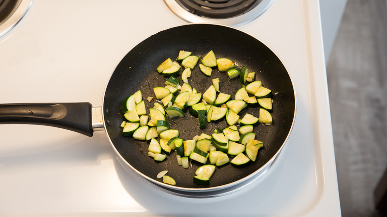 - Add the zucchini and salt and saute, stirring often, for 7-9 minutes until the zucchini is tender and starting to brown. Remove the zucchini from the pan and set it aside to cool, about 15-20 minutes.