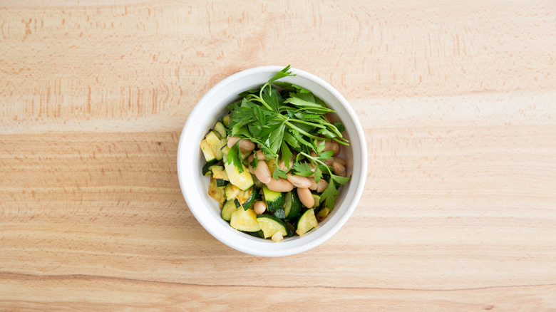 - To finish the green sauce, when the zucchini is cool, place it in a bowl (or blender) with the cannellini beans, parsley, and water.