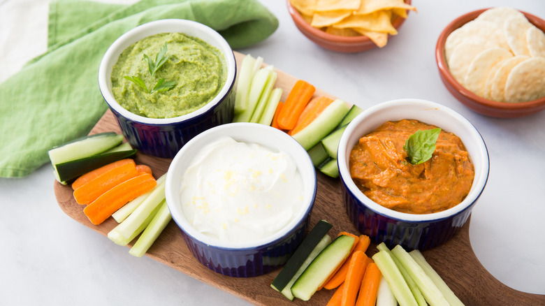 - Serve the trio of dipping sauces cool or at room temperature with your choice of crudités, chips, crackers, or mozzarella sticks.