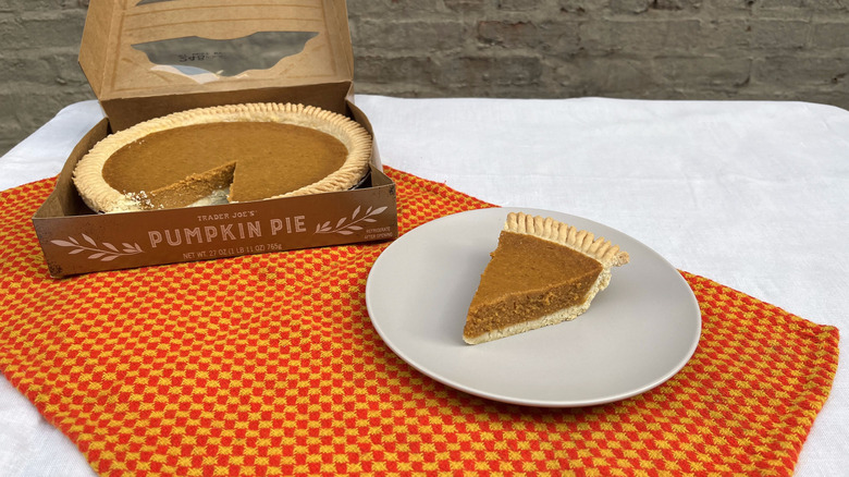 Stop & Shop may have hit the mark with its genuine pumpkin flavor, but Trader Joe's nailed it with the signature pumpkin pie spice. This perfectly crafted slice had the ideal filling-to-crust ratio and kept its shape till the end, unlike Costco's mushy mess. The filling is somehow airy while keeping a structured consistency, like a thick pumpkin mousse. The familiar texture was enough to lift its ranking, but the deep pumpkin pie flavors sealed the deal. Unlike the lower rankings on this list, the first bite introduced nutmeg, cinnamon, allspice, cloves, and ginger. This iconic blend is what we look for in pumpkin pie, but it's rare that each individual spice can be distinguished.