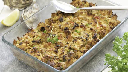 Oyster dressing begins with sauteed garlic, celery, yellow onion, and green bell pepper, topped by loads of Bell's poultry seasoning with oregano and marjoram and Old Bay seasoning. (You can whip up a batch of homemade Old Bay in five minutes, for the record.) Some recipes also include white button or cremini mushrooms, which serve as a utilitarian sponge for soaking up more flavorful oyster brine. In classic Northern stuffing fashion, oyster dressing uses half stale white bread cubes, plus half crumbled cornbread for savory flavor and Southern culinary influence. It all gets married together by a bold mixture of moisture elements: bright hot sauce, fresh lemon juice, chicken broth, and the oyster liquor.