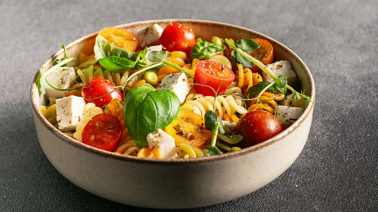 Once you choose your favorite pasta shape, you can experiment with mix-in ingredients. In general, you'll want to utilize something salty to add flavor, whether you're using feta cheese, olive brine, or capers – or all of the options. Fresh vegetables and equally fresh herbs likewise brighten any pasta salad — and, luckily, complement pasta of all shapes and ratios.