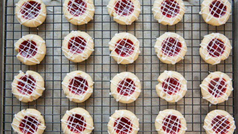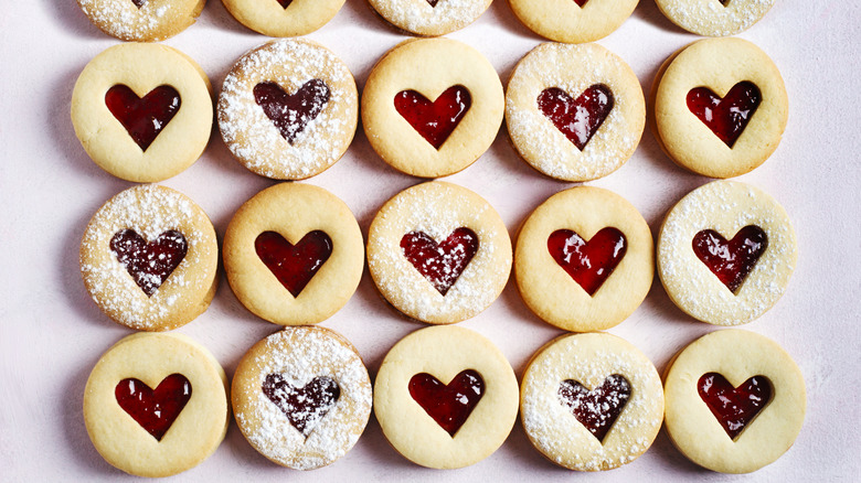 There's not a ton of information to be found on the Strawberries & Creme cookies sold by ABC Bakers in the mid-'90s. But thanks to a few Redditors, we have an idea of what these Girl Scout cookies were like — one user even claims that their mother still has a box in the freezer left over from almost 30 years ago. With a new recipe introduced in 1996 that classified this now-discontinued Girl Scout cookie as "reduced fat," the Strawberries & Creme cookies were in the style of a Linzer tart, with vanilla creme and strawberry jam sandwiched between two vanilla cookies. While you can buy Linzer tart cookies at most grocery stores, they're usually known for just being filled with jam, so the added inclusion of a vanilla creme is what made the Girl Scouts' version so special.