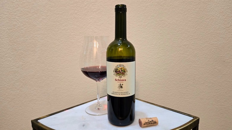 The historic Neustift Abbey crafts its light-bodied schiava red wine from vineyards within Italy's Alto Adige region. The abbey's vineyards sit at high elevations in the Dolomite Mountains foothills. Here, the schiava achieves full ripeness during the warm summer while maintaining freshness due to the day-to-night temperature shift, cooling the grapes while locking in acidity.