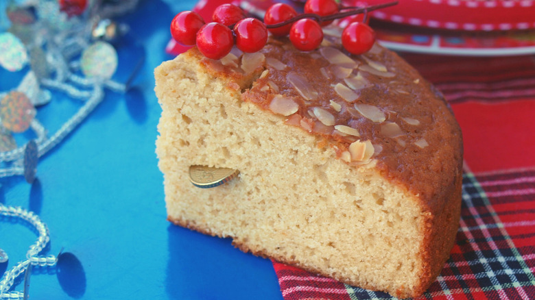 Vasilopita is a bready type of king cake originating in Greece, made with ingredients you'd expect from a cake; Milk, sugar, fat, and eggs. What gives this cake a flavor and texture twist is the added citrus juice — like lemon or orange — for that subtle hint of acid and the almond slivers that give you a pleasant crunch to your bites. Vasilopita, which directly translates to "sweet bread of Saint Basil," is a celebratory dish that's typically served during special occasions like New Year's. Traditionally, vasilopita would come with a small (oven-safe) trinket or coin baked into the batter — legend has it that whoever ended up with the treasure inside their slice of vasilopita would go on to have a year filled with good fortune.