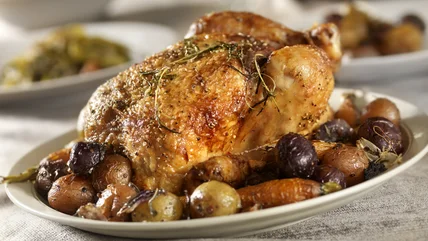To make the meal, consider following our classic roast chicken recipe, which uses extra virgin olive oil on the outside. You can use regular olive oil if you don't have EVOO in your kitchen. Other neutral oils like avocado and canola will work, but keep in mind that the same flavor factor won't be there for the poultry. And if you want to use butter, go with ghee because it has a higher smoke point, the milk solids aren't present, and it will be better off in the oven for a long period of time. No matter what your choice, coat the outside of the chicken with the chosen fat after it's seasoned with salt and pepper, but before it goes in the oven to cook.