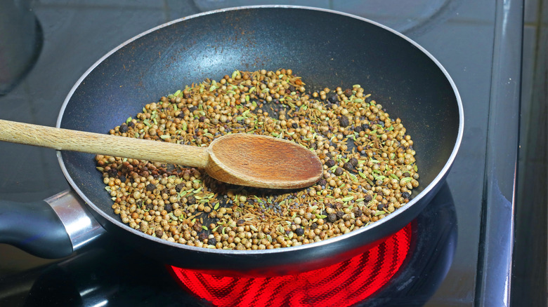To toast your spices, add them to a dry pan. The whole process will take less than five minutes. Turn the heat up to about medium heat, and keep your eye on them. You'll want to stir them regularly to prevent them from burning. You'll know they're toasting when you smell their aromas and see their color changing to slightly darker. You'll also likely see some smoke coming out of them, and if you're using whole spices, you'll hear a crackle.