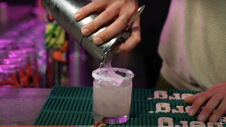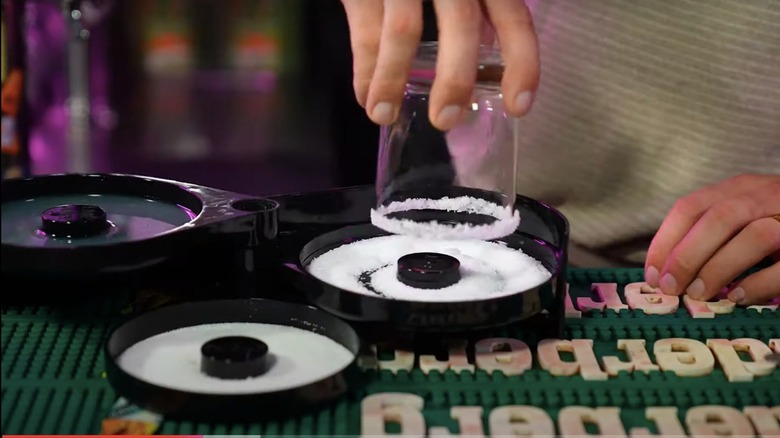 How heavily or lightly you rim your glass comes down to how you dip it. "How much salt you actually want on the rim depends on how much you dip it into the glass," explained Kamaron Lockwood. "You can go a little bit lighter, a little bit heavier — feel free to get carried away." That being said, Lockwood also says not to make it too thick. "Try to keep it a nice even layer ... not even more than maybe a 16th of an inch down the glass. It's a sugar rim, not a sugar glass," he said. Then, when it comes time to pour your margarita, be sure to do so into the middle of the glass and not near the sides. It might sound obvious, but any veers to the left or right will only wash away the unique cocktail rim you just created.