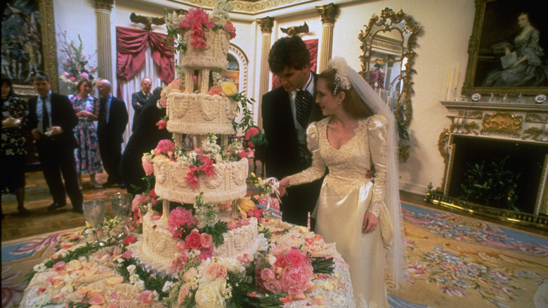 During the final decade of the 20th century, wedding cakes began to take on more of the personality of the bride and groom. For instance, while ivory and cream were the most popular colors and, per The Black Tux's survey, vanilla cake, yellow cake, and chocolate cake were still the top three flavor preferences (in that order), other wedding cake flavors, such as red velvet and strawberry, increasingly began to make an appearance. More often, couples were selecting cake toppers that represented their hobbies and occupations — and remember, these were the days before you could find anything on Etsy or Amazon!