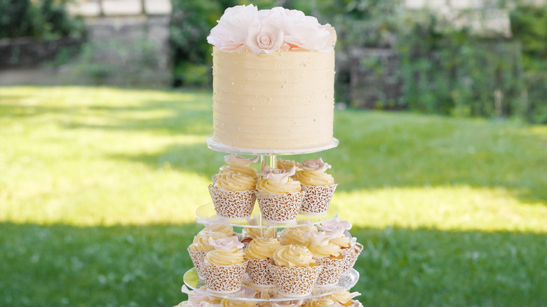 While it was relatively easy to provide multiple flavors of cupcakes, when it came to the wedding cake itself, the most commonly chosen flavors were vanilla, chocolate, red velvet, and yellow (in that order), per Food52. Red velvet cake especially enjoyed a surge in popularity, shooting from being the flavor of choice among 3% of couples in the 1990s to 11% of couples in the 2000s.
