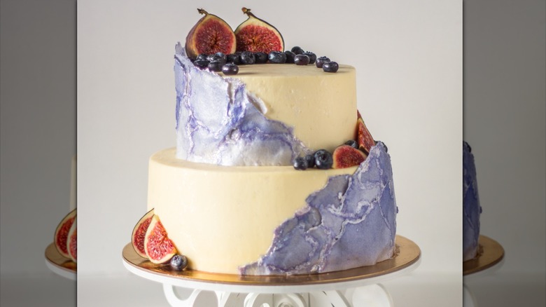 This decade saw pastel-hued, watercolor-like frosting techniques grace cake surfaces, which paired well with elegant gold leaf decorations. Fondant continued to be a popular choice, especially because TV programs shed light on how bakers could expertly manipulate the sugar paste into neat, unique designs. Sometimes, though, couples opted to serve a "naked cake." This cake isn't as scandalous as its name suggests; frosting is applied on top of each layer, but very little frosting (if any at all) is spread on the sides. Fresh fruits and flowers commonly adorn naked cakes to complement their bare, minimalistic, and natural appearance.