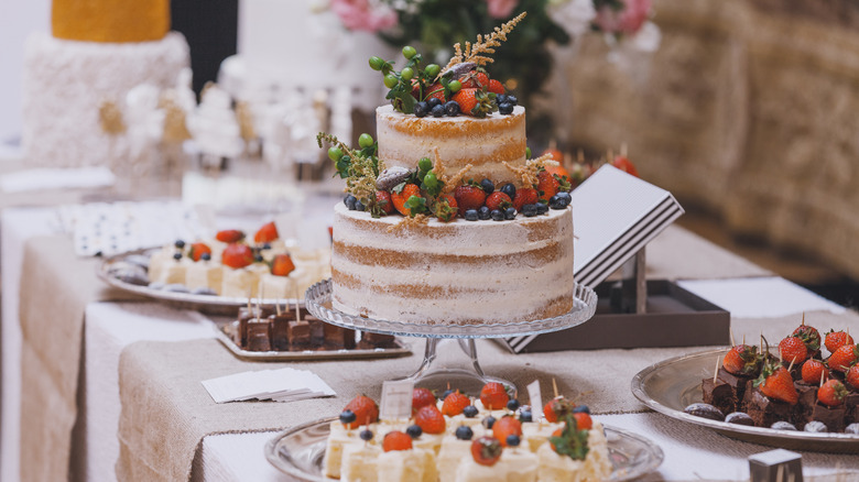 Of course, having a grand, exquisitely decorated wedding cake was still the norm. With all the flavors to choose from, a whopping 45% of couples during this decade chose to serve multi-flavored cakes, according to Food52. Favorite flavors were vanilla, chocolate, red velvet, and yellow, followed by other variations like coconut and strawberry. For instance, Harry And Meghan's wedding cake recipe, which was published in Claire Ptak's cookbook "Love is a Pink Cake: Irresistible Bakes for Morning, Noon, and Night," blended the flavors of lemon and an elderflower-infused liqueur.