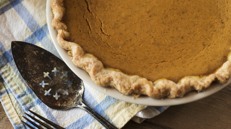 Store-bought pies are such a time-saver. However, pick up a pumpkin pie from the supermarket and every identical batch tastes and looks like it was made on a factory line; they simply don't have that homespun, cozy quality. Fortunately, there's an easy way to make a store-bought pie look homemade that lends it an inviting appearance and oodles of welcome texture in mere seconds — scatter some sugar over it and blowtorch the surface to create a crunchy creme brulee-like crust that can be cracked with a spoon.