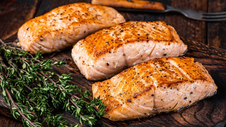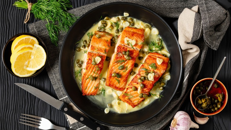 We've already touted the deliciousness of swapping out the chicken with scallops in your next piccata dish, so take a cue from the seafood switch and make a salmon piccata. In fact, a traditional Italian dish called pesce spada capperi e limone in padella is essentially a piccata made with swordfish, and salmon would make an excellent substitute for swordfish. The main ingredients in a piccata — lemon, capers, butter, and parsley — all play a key role in flavoring the salmon.