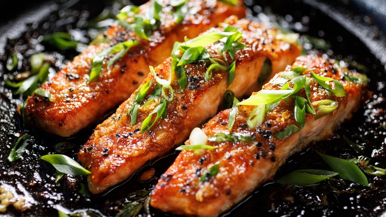 While teriyaki salmon is ubiquitous, you can put a new twist on it by opting for something with a slightly more mature flavor profile that's less sweet and a bit more pungent. By combining honey, ginger, garlic, and soy sauce, you'll get an experience that's reminiscent of teriyaki sauce without being cloyingly sweet. You can adjust the sweetness level to your preference by adding more or less honey, but be aware that the more honey you add, the more likely the sauce that pools around the salmon in the oven is going to burn due to the high sugar content.