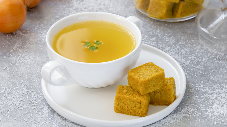 A bouillon cube is basically a tiny block of dehydrated broth. Due to its lack of moisture, cubes have especially concentrated flavors of their key ingredients like vegetables or meats (sometimes both) and various seasonings. Of these seasonings, however, MSG and salt are particularly prominent given their incredible ability to add and enhance flavor. While dissolving a cube in water dilutes some of bouillon's intensity, a single cube still imparts significant flavor as well as sodium. As a result, this becomes problematic should you season a soup, as per usual. The solution? Taste a bouillon-laced batch, before sprinkling in extra salt.