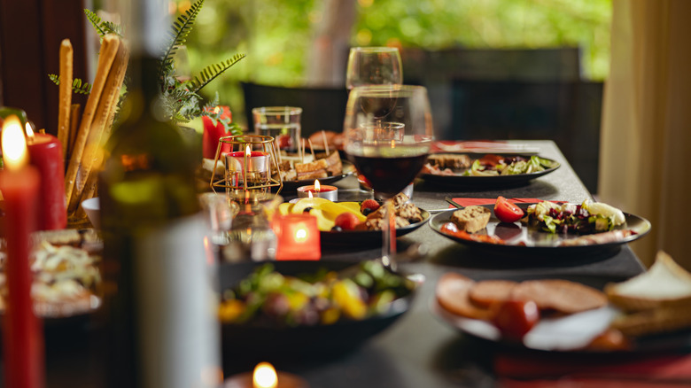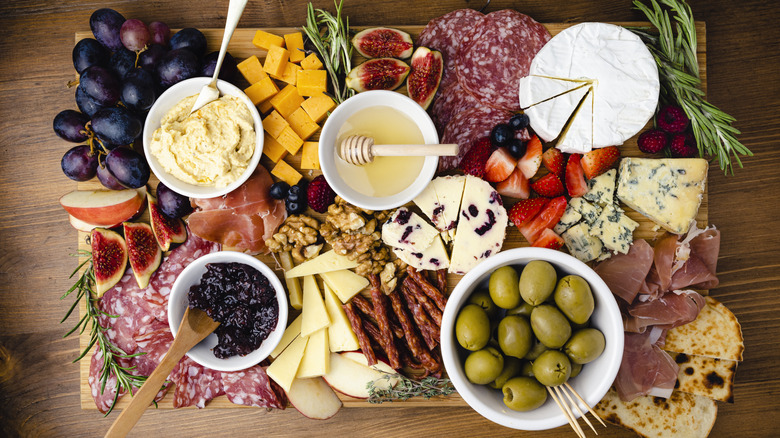 Preparing for a holiday buffet can be hectic, and there's nothing worse than your guests arriving to an overwhelmed host. If you want to keep your guests busy while you're setting up the buffet and cooking in the kitchen, make sure to prepare a hosting platter ahead of time. Think of premade items that can go on a tray or charcuterie board — like dips, crackers, breads, cheeses, fruits, meats, and more. You can prep these platters long before the party starts (or just buy them pre-made if you prefer) and set them out before your guests arrive so they'll have something to snack on while they wait for food.